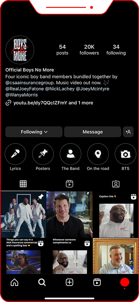 Bringing together one member of N*SYNC, 98 Degrees, New Kids On The Block and Boys II Men, we launched the ultimate boy band with an original song for AAA Insurance. Four legendary boys, one legendary message: “We’ll make it right!”. And it took the internet by storm. Meet Boys No More.